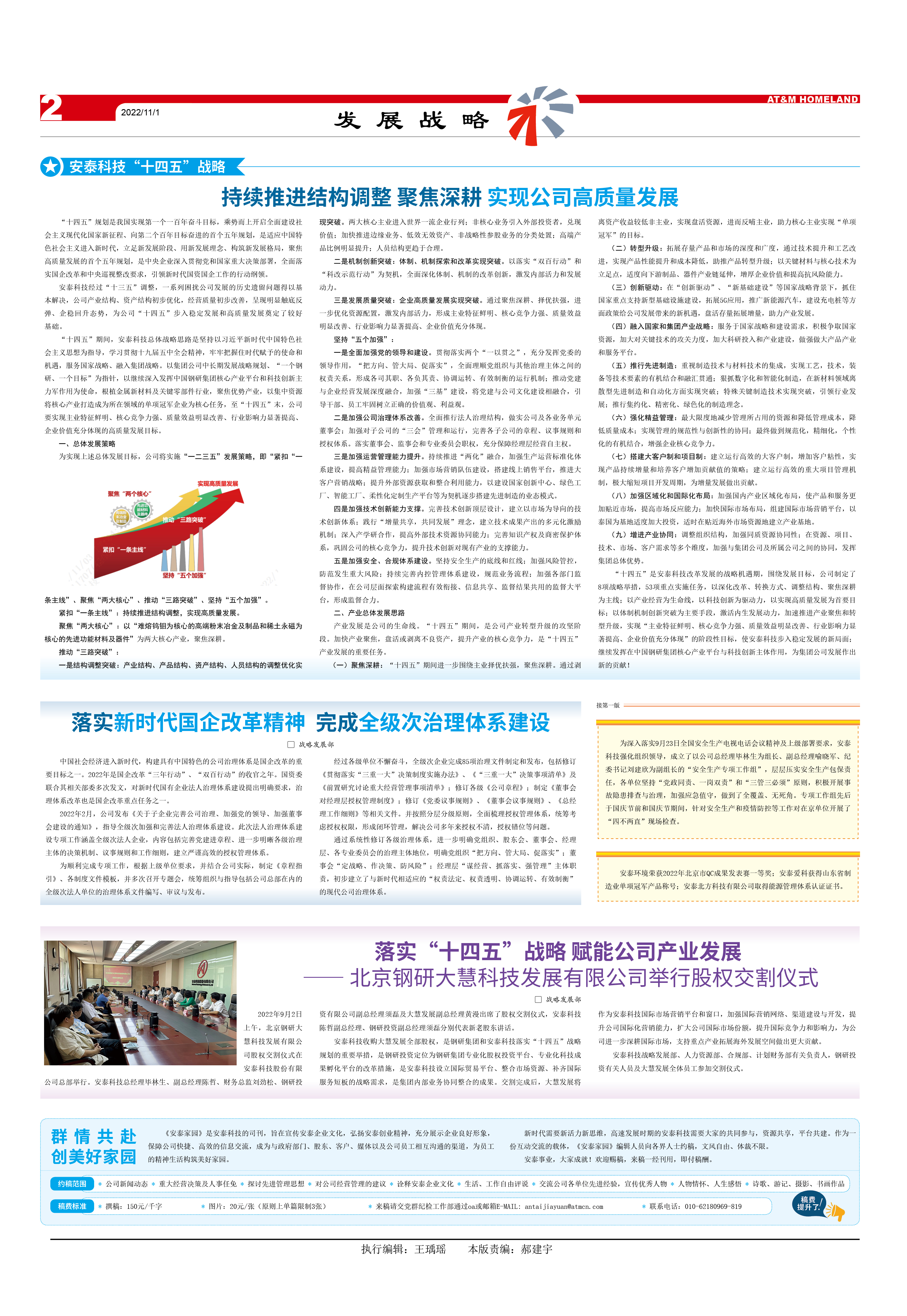 “十四五”是安泰科技改革發展的戰略機遇期,圍繞發展目標,公司制定了8項戰略舉措,53項重點實施任務,以深化改革、轉換方式、調整結構、聚焦深耕為主線;以產業經營為生命線,以科技創新為驅動力,以實現高質量發展為首要目標;以體制機制創新突破為主要手段,激活內生發展動力,加速推進產業聚焦和轉型升級,實現“主業特征鮮明、核心競爭力強、質量效益明顯改善、行業影響力顯著提高、企業價值充分體現”的階段性目標,使安泰科技步入穩定發展的新局面;繼續發揮在中國鋼研集團核心產業平臺與科技創新主體作用,為集團公司發展作出新的貢獻!