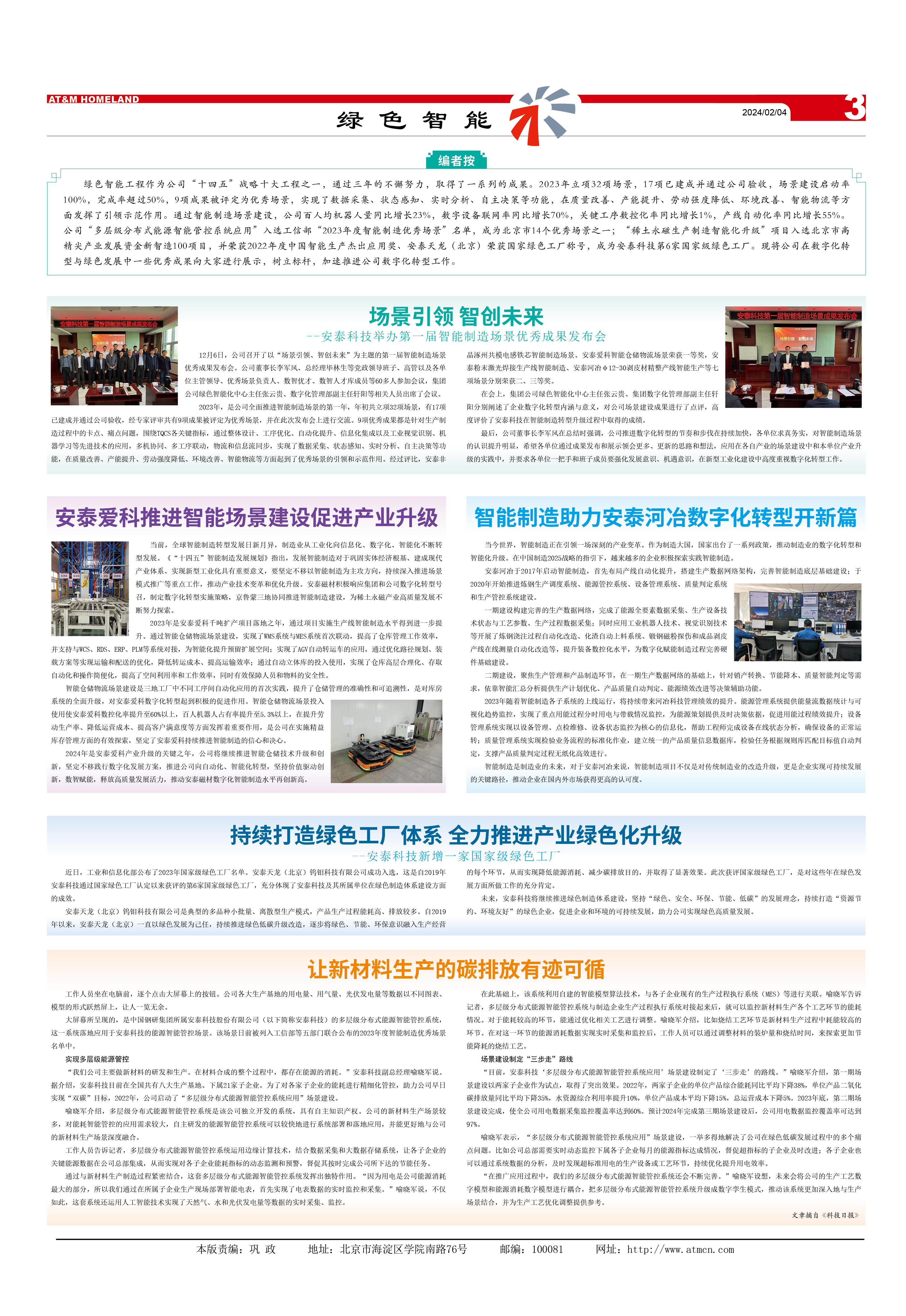 綠色智能工程作為公司“十四五”戰略十大工程之一,通過三年的不懈努力,取得了一系列的成果。2023年立項32項場景,17項已建成并通過公司驗收,場景建設啟動率100%,完成率超過50%,9項成果被評定為優秀場景,實現了數據采集、狀態感知、實時分析、自主決策等功能,在質量改善、產能提升、勞動強度降低、環境改善、智能物流等方面發揮了引領示范作用。通過智能制造場景建設,公司百人均機器人量同比增長23%,數字設備聯網率同比增長70%,關鍵工序數控化率同比增長1%,產線自動化率同比增長55%。公司“多層級分布式能源智能管控系統應用”入選工信部“2023年度智能制造優秀場景”名單,成為北京市14個優秀場景之一;“稀土永磁生產制造智能化升級”項目入選北京市高精尖產業發展資金新智造100項目,并榮獲2022年度中國智能生產杰出應用獎、安泰天龍(北京)榮獲國家綠色工廠稱號,成為安泰科技第6家國家級綠色工廠。現將公司在數字化轉型與綠色發展中一些優秀成果向大家進行展示,樹立標桿,加速推進公司數字化轉型工作。